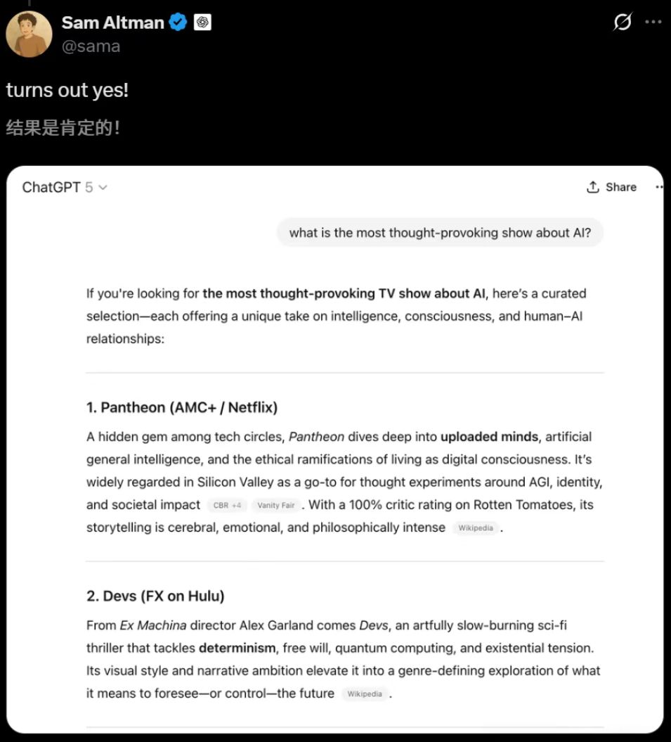8 月 3 日,OpenAI 首席执行官山姆・奥尔特曼 (Sam Altman) 还在 X 平台上放出了所谓的 GPT-5 对话记录,提前剧透了该模型的使用体验。在对话记录中,奥尔特曼让 GPT-5 推荐几部最引人深思的 AI 主题电视剧,GPT-5 随即给出了一个片单。