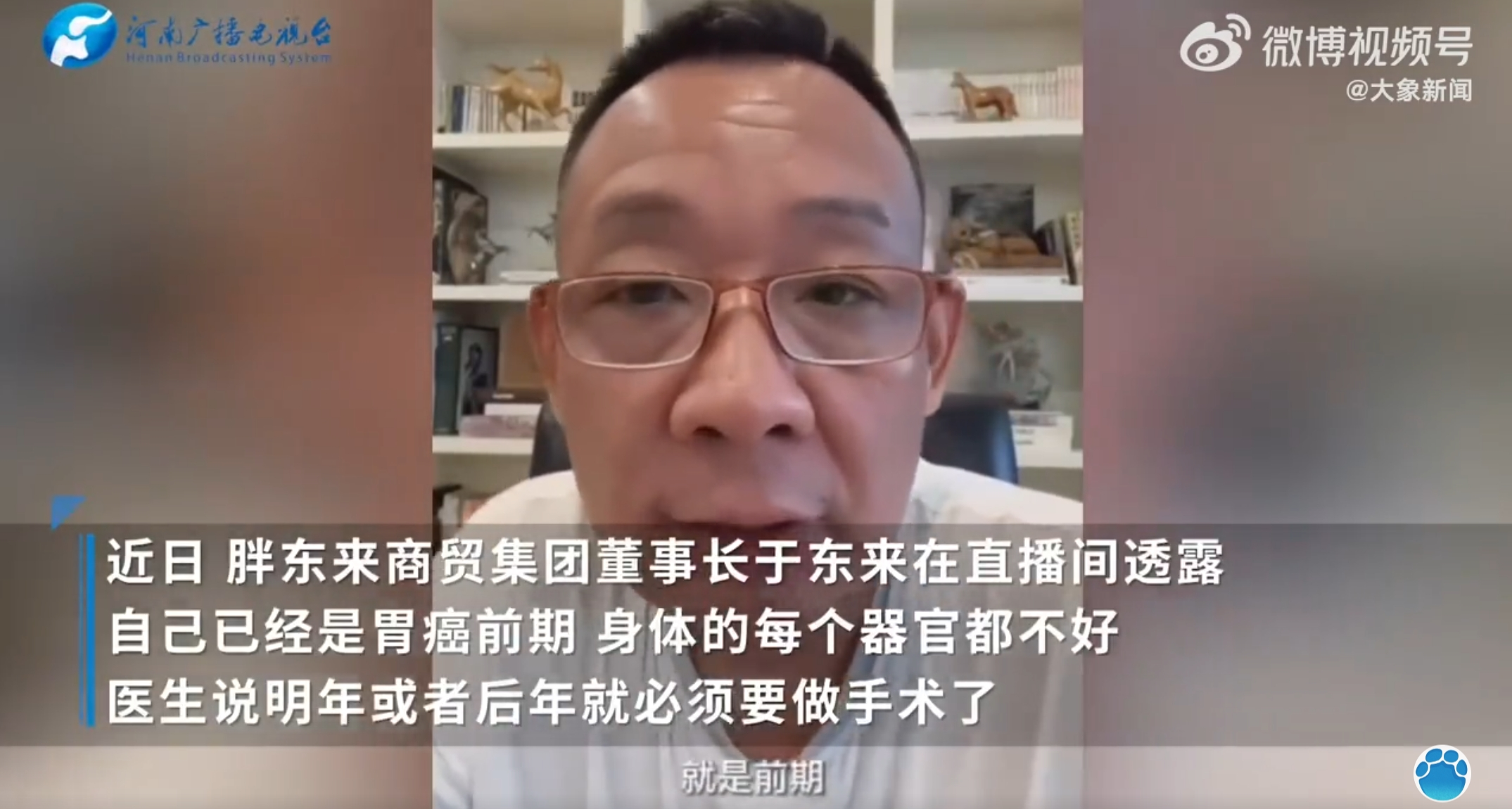 图片来源:于东来抖音账号据大象新闻 2024 年 6 月报道,胖东来商贸集团董事长于东来在直播间透露自己已是胃癌前期,称自己身体的每个器官都不好,医生说明年或者后年就必须要做手术了。