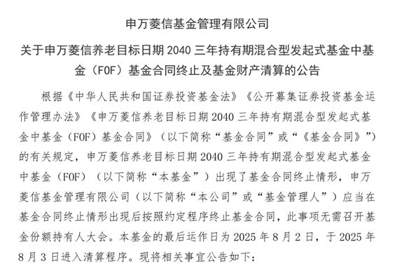 此外,近日又有养老目标基金清盘,截至 2025 年 8 月 2 日,申万菱信养老目标日期 2040 三年持有期混合在运作 3 年后,因规模达不到存续条件而清盘。