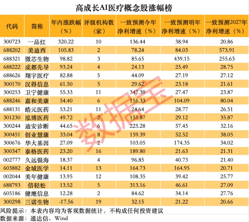 A 股市场上和 AI 制药相关的概念题材是 AI 医疗,合计有 82 股。从未来成长性来看,根据两家以上机构一致预测,有 20 股今年、明年及 2027 年净利增速均超 20%。这些高成长概念股主要集中在医药生物行业,和 AI 制药相关性较高的个股并不多,其中部分个股研报中有提及 AI 相关信息。
