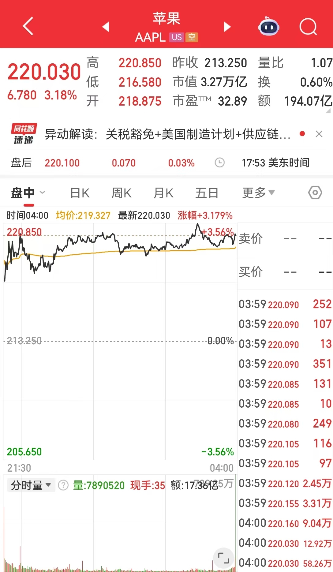 苹果报 220.03 美元,涨幅 3.18%,最新市值 3.27 万亿美元,其市值一夜增加 1006 亿美元 (约合人民币 7225 亿元)。此前这家 iPhone 制造商宣布,未来四年将追加 1000 亿美元用于支持美国本土公司和供应商。这是在其 2 月宣布的 5000 亿美元投资计划基础上的新增投入。