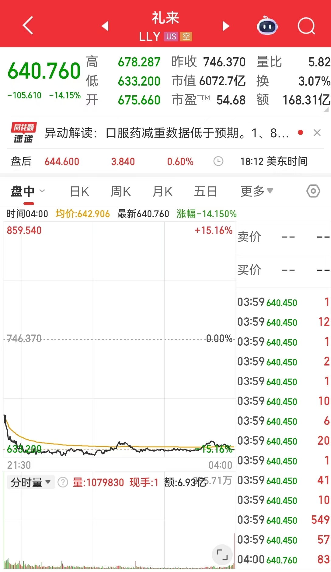 礼来股价暴跌 14.15%。创自 2000 年 8 月以来最大单日跌幅,总市值为 6072.7 亿美元。
