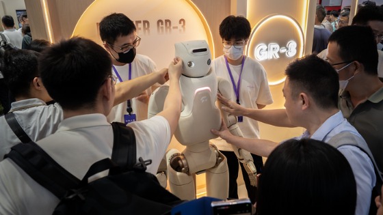 这款身高 1.65 米、体重 71 公斤的双足人形机器人最大特点是外形设计上的 「亲人性」。据现场工厂人员介绍,GR3 的皮肤包裹了一层特殊固特棉柔性材料,卡通外形的造型灵感来自于迪士尼与漫威合作动画电影 《超能陆战队》 中的 「大白」 机器人。公司计划将其应用在康复医院认知训练、宣教引导场景,未来还将推广到社区或养老机构提供必要的陪护。