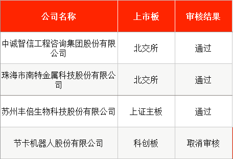 发审委审核方面,上交所、北交所上周均召开新一期上市审核委员会审议会议。其中,拟在北交所 IPO 的中诚智信工程咨询集团股份有限公司 (下称 「中诚咨询」)、珠海市南特金属科技股份有限公司 (下称 「南特科技」),拟在沪市主板 IPO 的苏州丰倍生物科技股份有限公司 (下称 「丰倍生物」) 均成功过会。