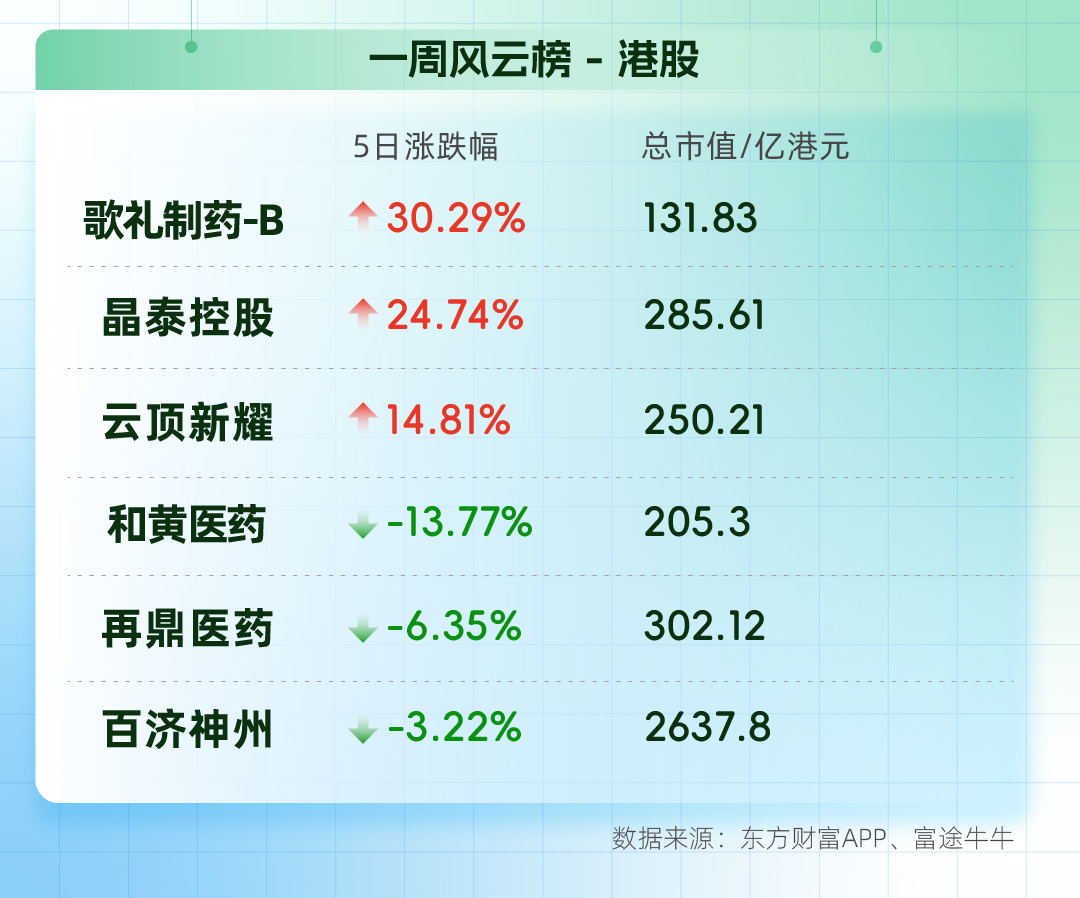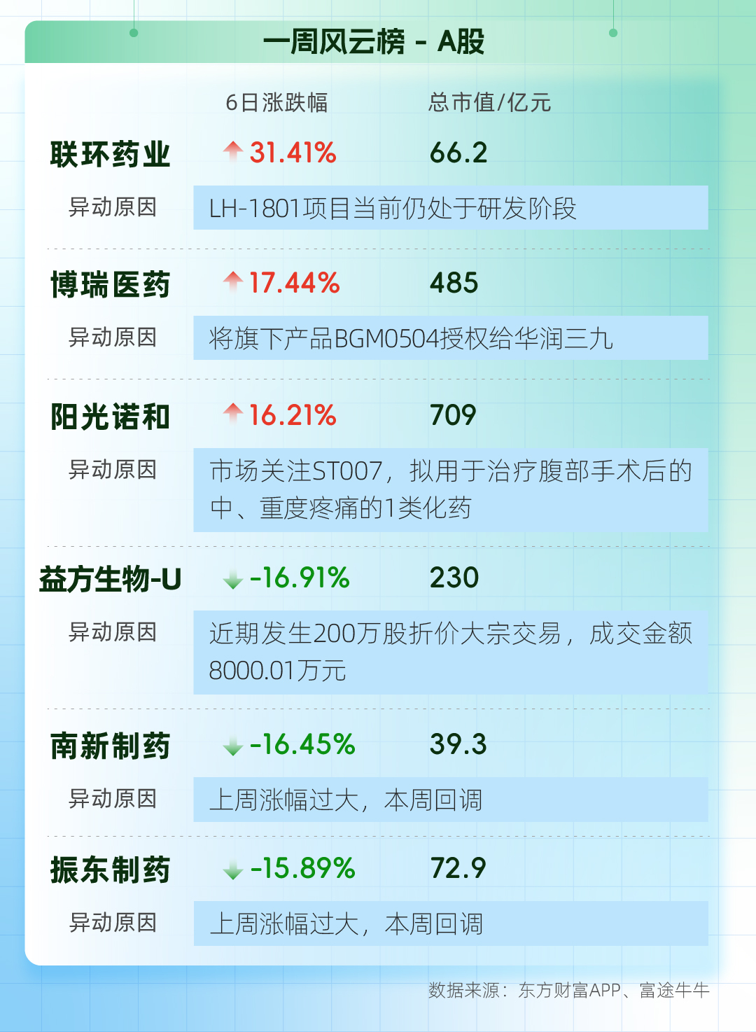 东方财富数据显示,A 股创新药概念 140 只个股中,34 只上涨,比前一周减少 72 只,回调明显。近 6 个交易日涨幅超过 20% 的有 1 家公司,前一周为 10 家。富途牛牛显示,港股情况稍好,39 只个股中 22 只上涨。