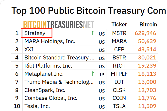 根据 Bitcoin Treasures 数据,2025 年二季度,美国上市公司购买了约 13.1 万枚比特币,较前一季度增长 18%。Strategy 是公司持有比特币的领头羊,目前持有约 62.9 万枚比特币;紧随其后的是比特币矿商 Mara,拥有 5 万枚比特币。