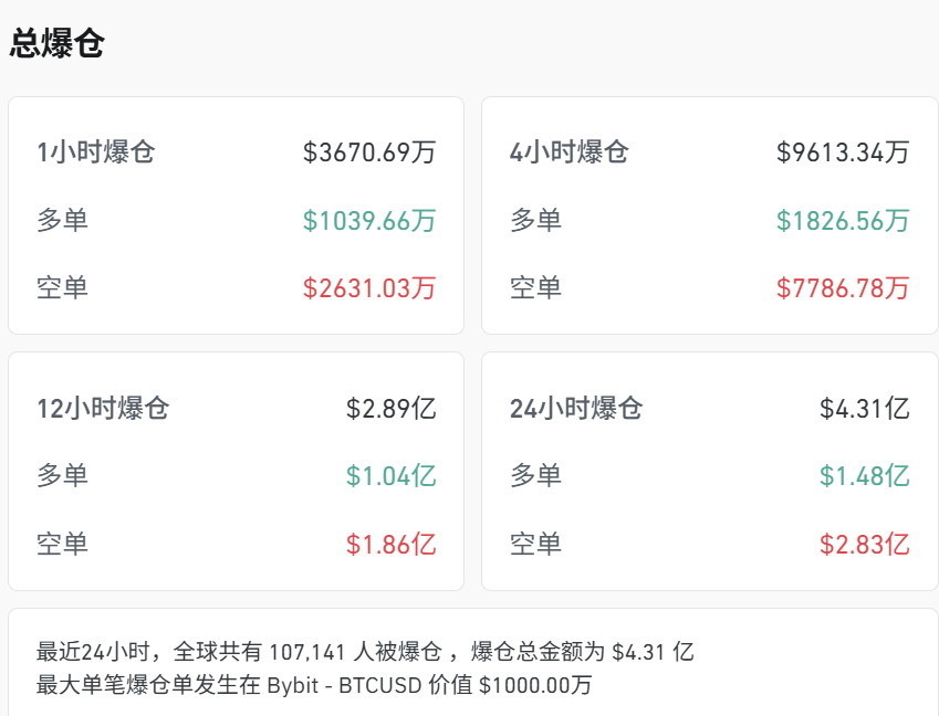 CoinGlass 数据显示,最近 24 小时内,全球共有 10.7 万人爆仓,爆仓总金额达 4.31 亿美元。其中,多单爆仓金额达到 1.49 亿美元,空单爆仓金额达到 2.83 亿美元。最大单笔爆仓单发生在 Bybit-BTCUSD,价值为 1000 万美元。