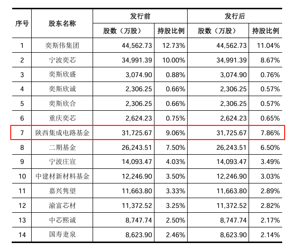 招股书显示,陕西集成电路基金以 9.06% 的持股比例位列公司第三大股东,亦是持股量最大的机构投资者。长安汇通则参与了西安奕材两轮融资及上市前的老股受让。此外,陕西民营基金、光子强链等本土机构纷纷 「下注」。