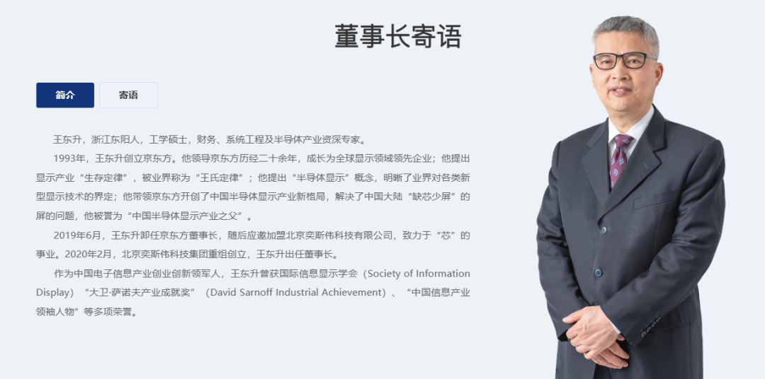 1993 年,王东升创立京东方。在其掌舵的二十余年里,京东方从无到有,成为全球最大的液晶面板制造商,解决了中国大陆 「缺芯少屏」 中屏的被动局面,他提出的显示产业 「生存定律」 被业界尊称为 「王氏定律」,其本人亦被誉为 「中国半导体显示产业之父」。