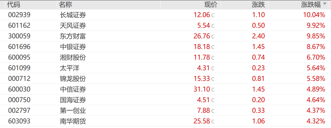 今日券商板块强劲拉升,截至收盘,证券板块整体涨幅近 4%,成交额突破 1200 亿元。