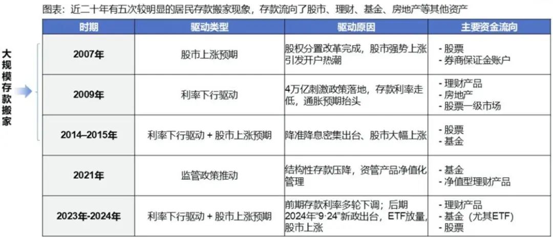 那么,资金都流向哪里呢?据国海证券研报,据对过往几轮的存款搬家的复盘发现,由于驱动原因不同,资金流向也呈现出差异化,股票、基金、理财产品、房地产等均在不同时期承接了资金的流入。但是近年来随着房地产市场的低迷,预计地产对本轮存款资金的吸引力将显著下降。
