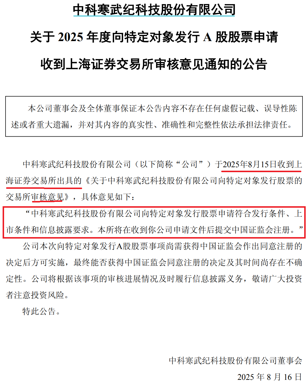 寒武纪 8 月 15 日晚发布公告称,公司收到上交所审核意见,确认公司向特定对象发行 A 股股票申请符合发行、上市及信息披露要求,上交所将在收到公司申请文件后提交证监会注册;公司同时提示,最终能否获得证监会同意注册的决定及其时间尚存不确定性。