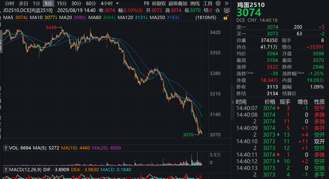 8 月 19 日,国内期货市场鸡蛋主力合约 2510 价格继续下挫,盘中最低报 3070 元/500 千克,为 2016 年 10 月以来低点。