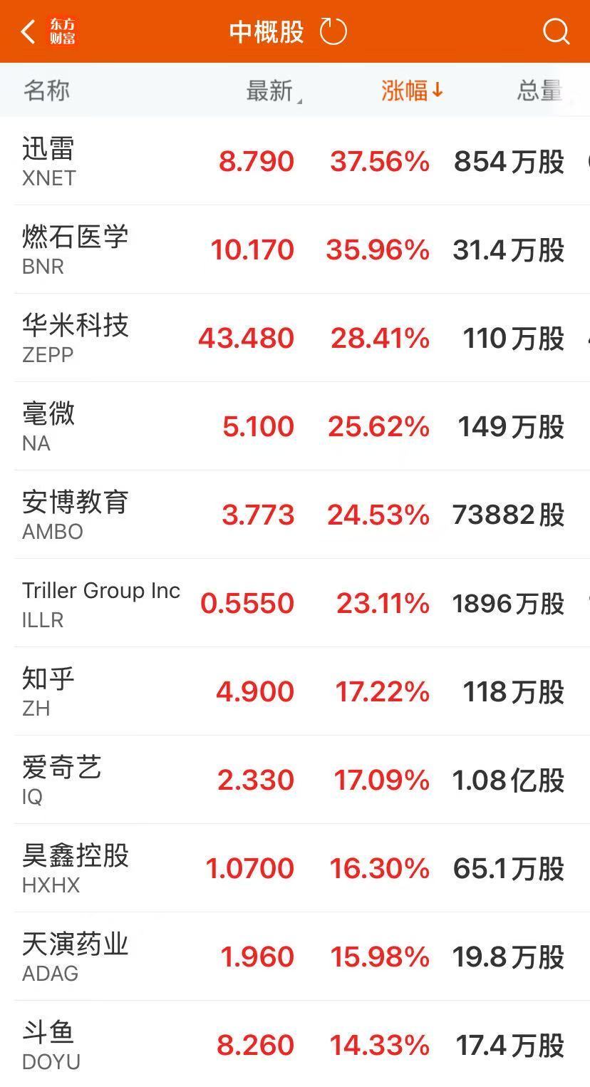 热门中概股多数上涨,纳斯达克中国金龙指数涨 0.12%。热门个股方面,迅雷涨超 37%,知乎、爱奇艺涨超 17%,斗鱼涨超 14%,金山云涨超 5%,名创优品涨超 4%,微博涨超 3%,哔哩哔哩涨超 2%;小牛电动跌超 9%,好未来跌超 3%。