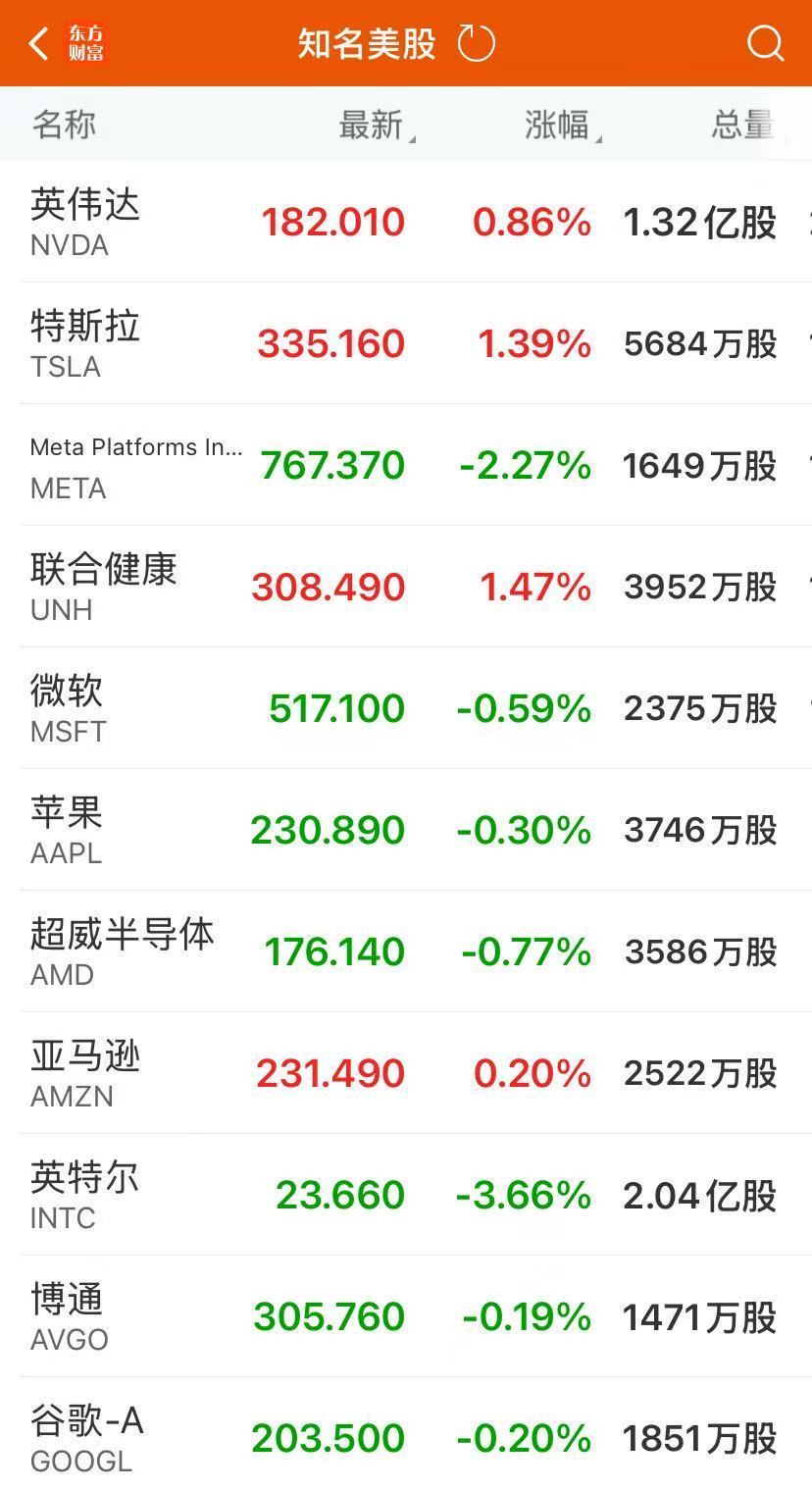 大型科技股涨跌不一,英特尔跌超 3%,结束此前连续六个交易日上涨的趋势;Meta 跌逾 2%,苹果、微软、谷歌小幅下跌;特斯拉涨超 1%,奈飞、亚马逊小幅上涨。