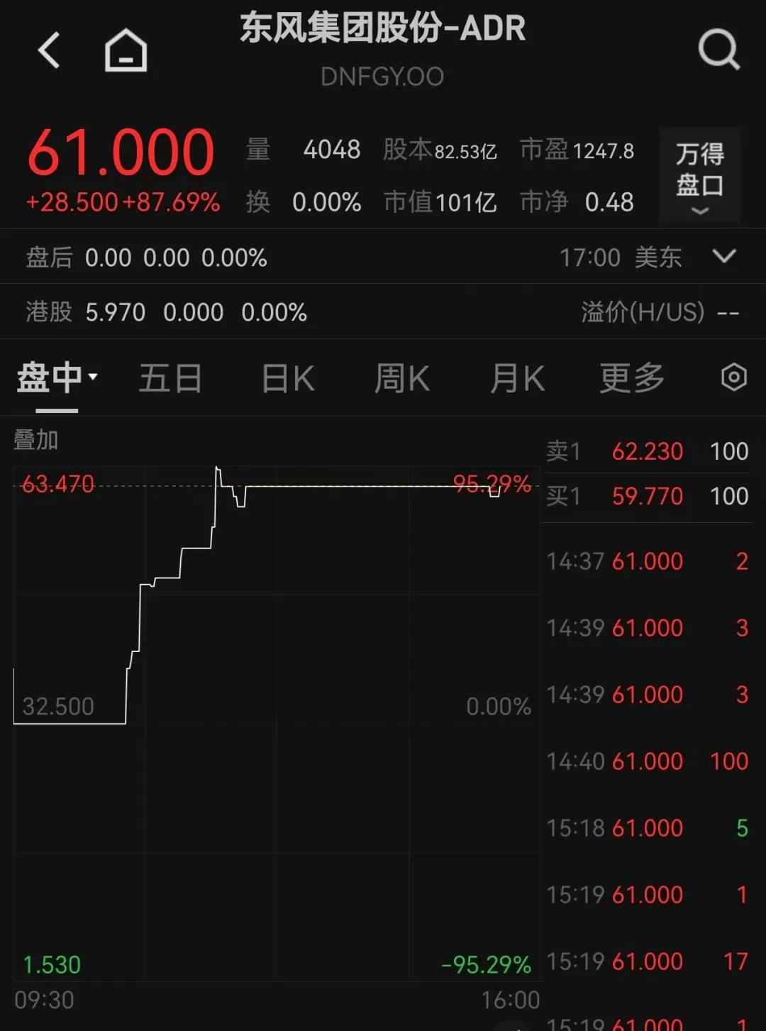 22 日晚公告一出,截至 8 月 23 日零点,东风集团股份 ADR 报价 62.22 美元,一个小时内暴涨超 91%;收盘涨幅为 87.69%,报 61 美元。