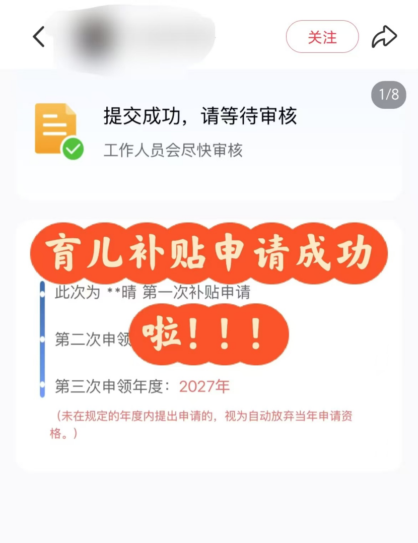 此外,支付宝和微信的 「育儿补贴」 小程序已上线,不少网友在社交媒体晒出自己成功提交育儿补贴申领的截图。
