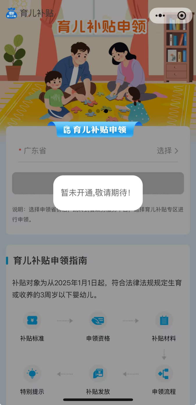 此外,记者注意到,微信 「育儿补贴」 小程序目前也已经上线,页面显示,选择申领省份后,将跳转到省政务服务平台,选择育儿补贴专区进行申领。不过,记者尝试选择具体省份后,均提示暂未开通。
