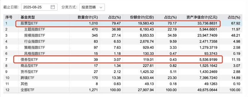 第五个万亿的跨越时间有望压缩至 4 个月。如前所述,市场行情带动 ETF 新发与净值的攀升。在这一阶段,表现最为亮眼的是债券 ETF 和行业主题 ETF。债券 ETF 年内资金净流入 3164 亿元,最新规模达到 5530.8 亿元,诞生了基准做市信用债 ETF 和科创债 ETF 两大千亿规模赛道 ETF。其中,债券 ETF 中百亿产品占比最高,39 只产品中有 25 只规模超百亿。此外,股票 ETF 中,行业主题 ETF 涨幅明显,份额增加最大的行业为金融,份额增加最大的主题为中证机器人指数。