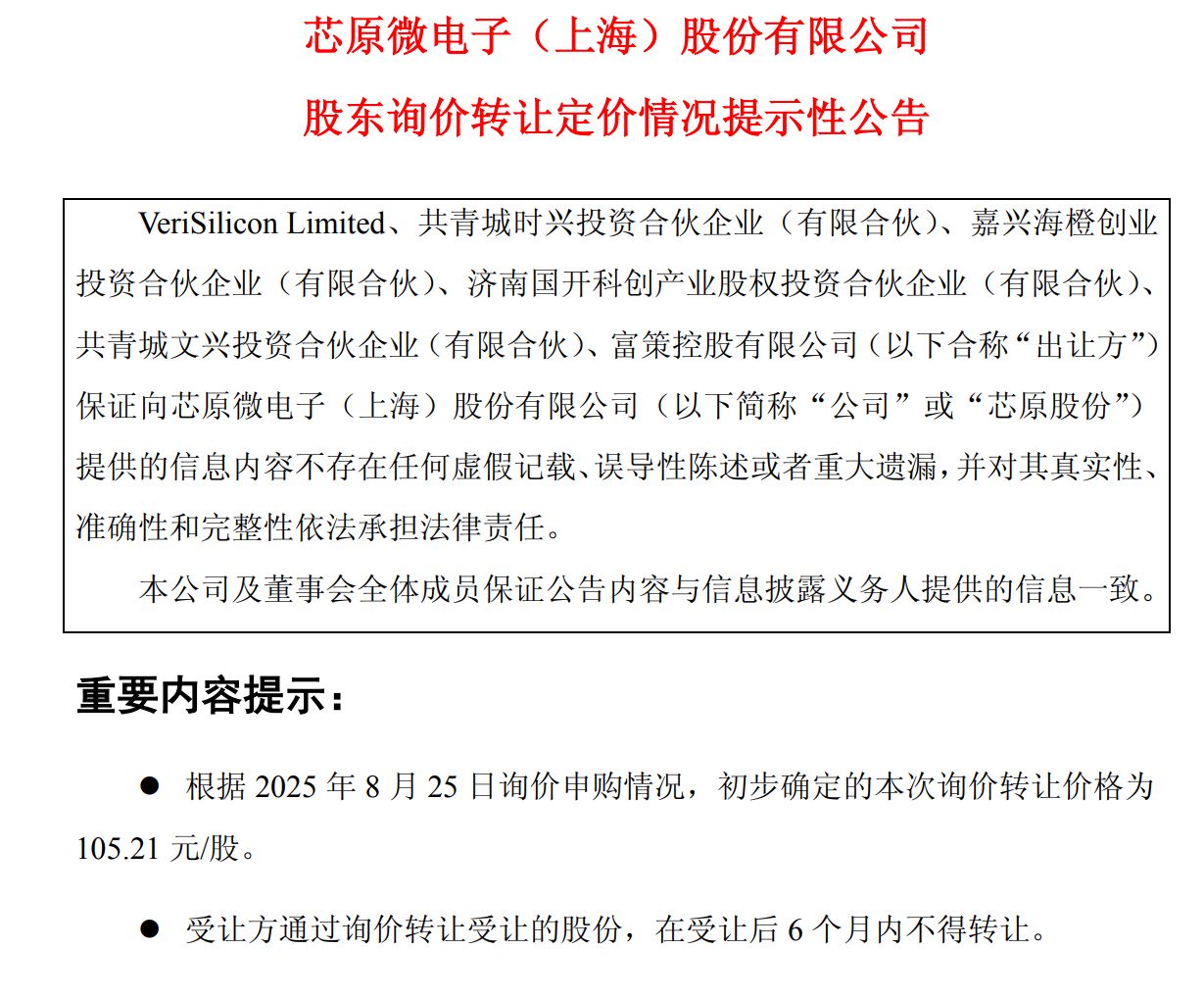 8 月 25 日晚间,芯原股份发布公告,披露股东询价转让定价情况,初步确定本次询价转让价格为 105.21 元/股。