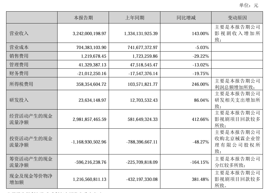 8 月 26 日晚间,北京光线传媒股份有限公司 (光线传媒,300251.SZ) 发布 2025 年半年度报告,上半年公司实现营业收入 32.42 亿元,同比增长 143%;归属于上市公司股东的净利润为 22.29 亿元,同比增长 371.55%。公司计划不派发现金红利,不送红股,不以公积金转增股本。对于营收增长,半年报解释称,主要是本报告期公司影视剧收入增加所致。