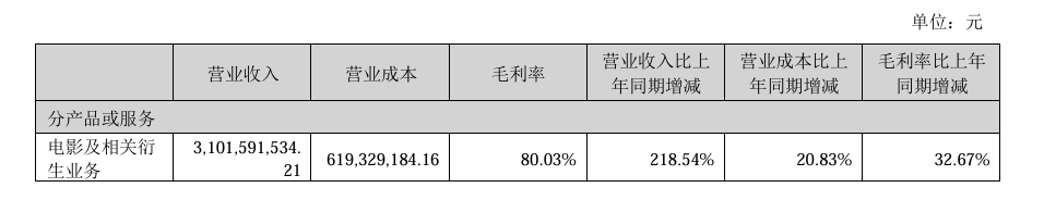 据半年报,光线传媒业务以影视项目的投资、制作、发行为主,主要产品为影视作品及相关衍生内容,业务已覆盖电影、电视剧 (网剧)、动漫、IP 运营、音乐、文学、艺人经纪、实景娱乐、产业投资等领域。公司电影及相关衍生业务上半年营业收入 31.02 亿元,同比增长 218.54%,毛利率为 80.03%。以此计算,电影及相关衍生业务在公司总营收中占比 95.68%。