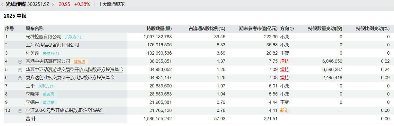 据半年报披露,光线传媒前五大股东分别为光线控股有限公司、上海汉涛信息咨询有限公司、李晓萍、杜英莲、李德来,持股比例依次为 37.40%、6.00%、3.94%、3.50%、2.99%。其中,杜英莲与光线控股有限公司董事长、公司实际控制人王长田为夫妻关系。从前十大流通股股东变化情况来看,期内 3 股东增持,1 股东新进。其中,香港中央结算有限公司增持 604.61 万股,占流通 A 股比例升至 1.37%;华夏中证动漫游戏 ETF 增持 659.63 万股,占流通 A 股比例升至 1.26%;易方达创业板 ETF 增持 249.54 万股,占流通 A 股比例升至 1.26%;中证 500ETF 为新进股东,占流通 A 股比例为 0.78%。