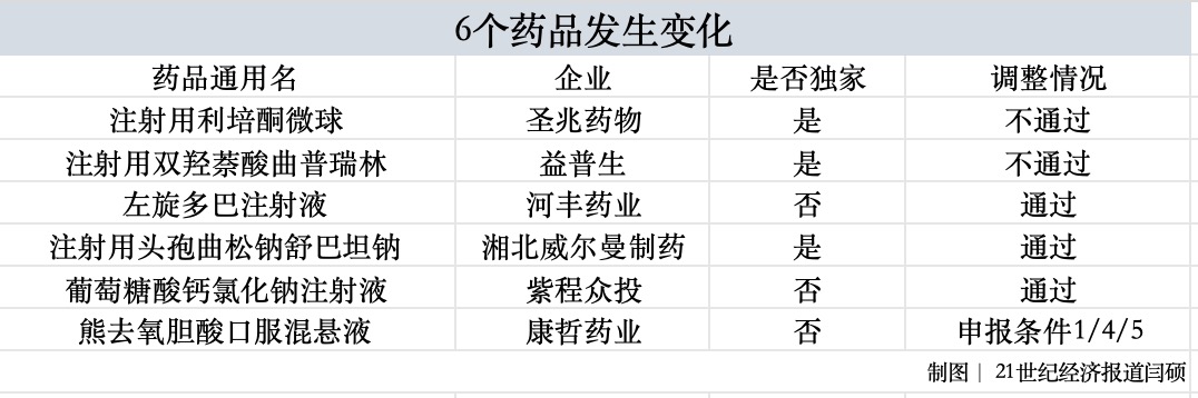 与 8 月 12 日公布的版本相比,6 个药品形式审查结果发生变化,其中注射用利培酮微球、注射用双羟萘酸曲普瑞林调整为不通过;左旋多巴注射液、葡萄糖酸钙氯化钠注射液调整为通过;另外,熊去氧胆酸口服混悬液仍为通过,但 「通过申报条件」 有所调整。