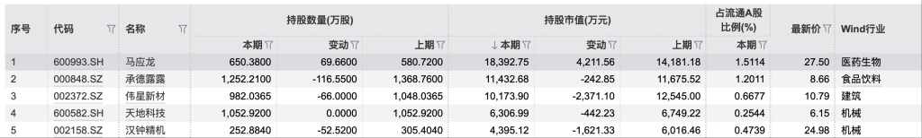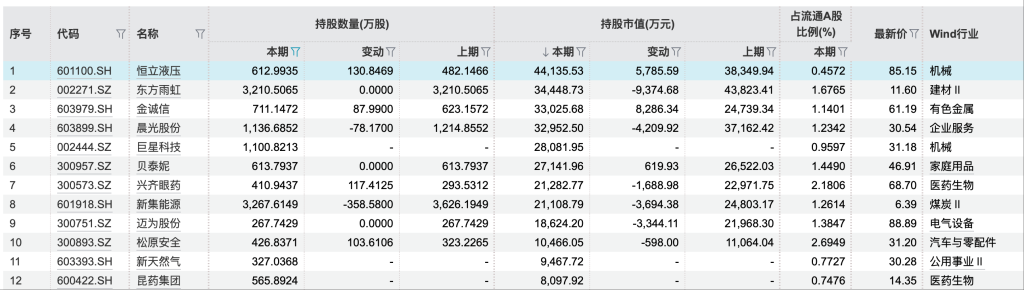 恒立液压是其持仓市值最重的股票,本期持有 612.99 万股,加仓 130.85 万股,持仓市值 4.41 亿元。东方雨虹(002271)、金诚信(603979)、晨光股份(603899) 的期末持仓市值也超过 3 亿元。