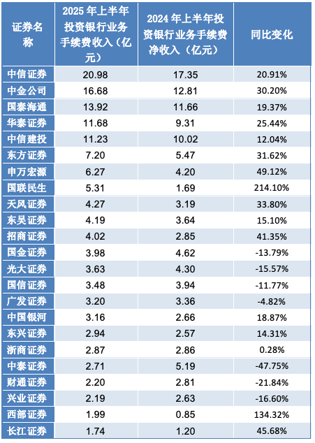 从收入排名来看,5 家头部券商投行业务手续费收入超过 10 亿元。其中,中信证券上半年投行业务手续费收入为 20.98 亿元,同比增长 20.91%;中金公司为 16.68 亿元,同比增长 30.32%;国泰海通、华泰证券、中信建投等投行业务手续费收入也超过 10 亿元。