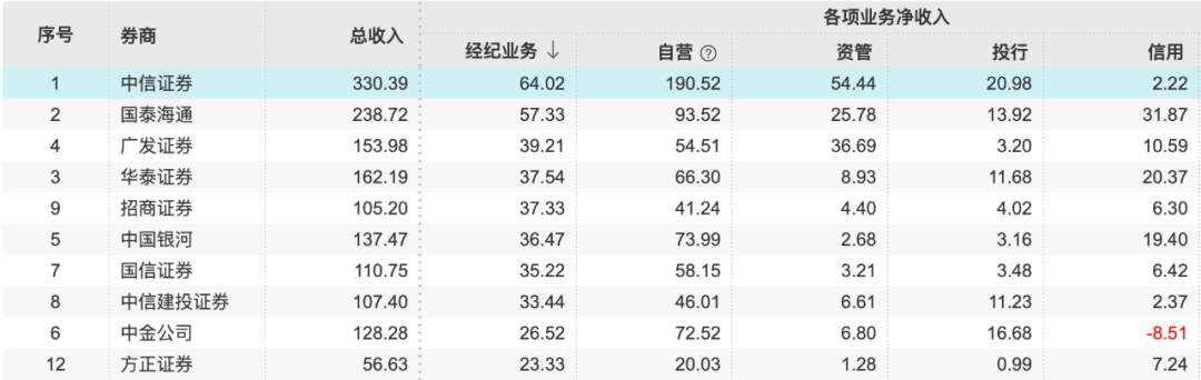 以 「公允价值变动净收益+投资净收益-对联营企业和合营企业的投资收益」 的口径计算,36 家上市券商自营收入均录得同比增长,6 家下滑。