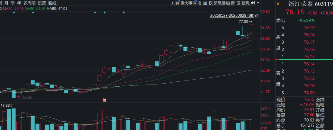 以浙江荣泰为例,8 月 29 日,该股上涨 7.82%,收盘价创历史新高,自 7 月 1 日以来累计涨幅达 64.68%。