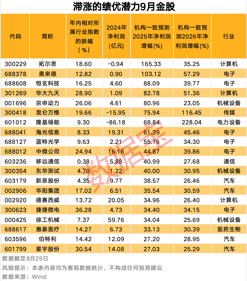 据数据宝统计,年内跑输所属行业指数涨幅,且机构一致预测公司 2025 年、2026 年净利润增幅持续超过 20% 的 9 月金股共有 20 只。