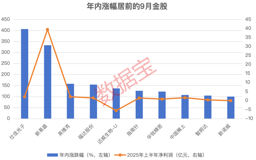 除迈威生物-U、新诺威外,年内涨幅超过 100% 的 9 月金股上半年均实现盈利。仕佳光子今年上半年净利润 2.17 亿元,同比增长超 17 倍;新易盛今年上半年净利润同比增长超 350%。