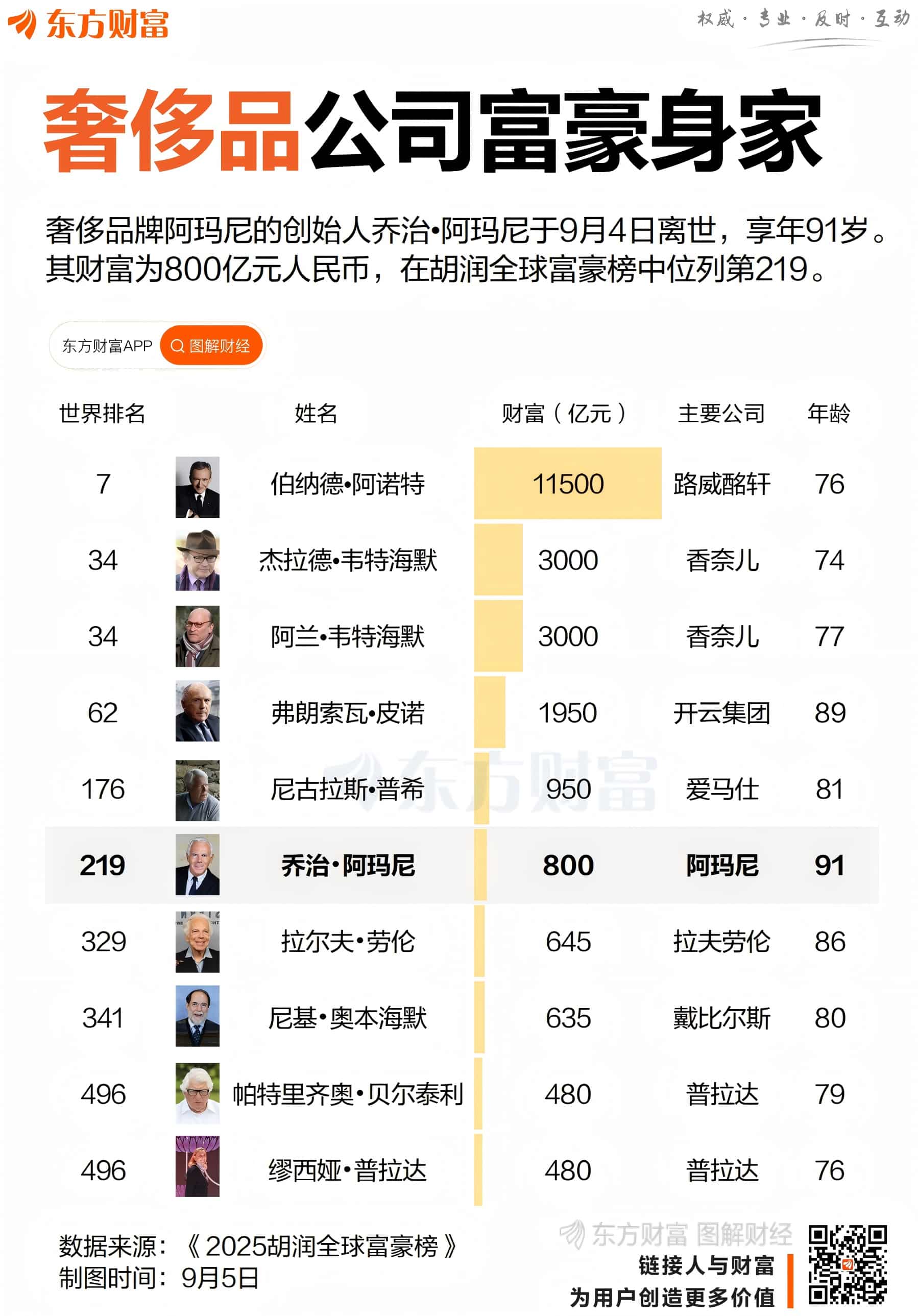 横向来看,奢侈品公司中,身家比乔治·阿玛尼高的有五位。其中身家最高的是路威酩轩的 CEO 伯纳德阿诺特,为 1.15 万亿元,世界排名第 7。其后,杰拉德韦特海默和阿兰韦特海默身家均为 3000 亿元,世界排名同为 34,这对兄弟共同掌控香奈儿;开云集团 (拥有 Gucci 等品牌) 董事长弗朗索瓦皮诺身家 1950 亿元,世界排名第 89;最后一位是爱马仕的品牌继承人尼古拉斯普希,身家 950 亿元。