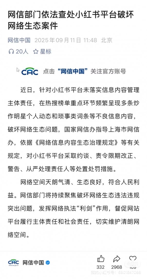 今日午间,网信中国发布信息,近日,针对小红书平台未落实信息内容管理主体责任,在热搜榜单重点环节频繁呈现多条炒作明星个人动态和琐事类词条等不良信息内容,破坏网络生态问题,国家网信办指导上海市网信办,依据 《网络信息内容生态治理规定》 等有关规定,对小红书平台采取约谈、责令限期改正、警告、从严处理责任人等处置处罚措施。