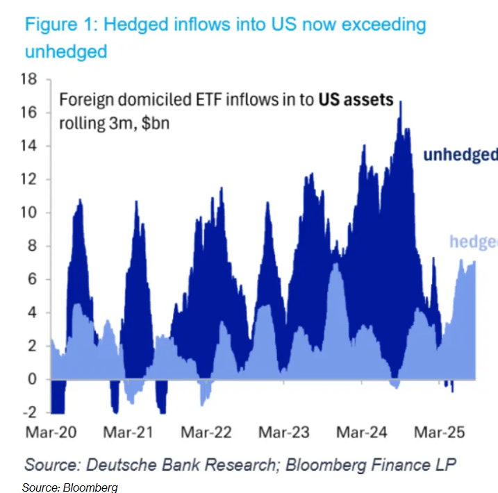 海外投资者正在以 「前所未有的速度」 削减美元敞口,因为他们在购买美国股票和债券时进行了货币对冲。根据德意志银行对交易所交易基金 (ETF) 的分析,本十年首次出现美元对冲 ETF 的资金流入超过非对冲基金的情况。