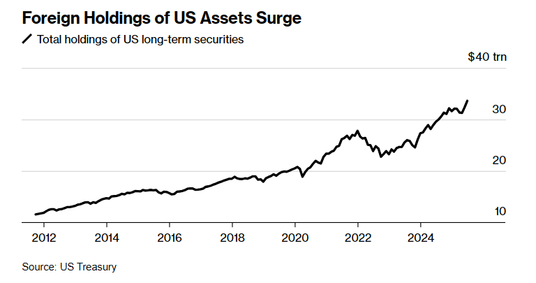 与此同时,美国财政部的数据显示,外国投资者持有的美国股票和债券在 6 月份飙升至创纪录水平,此前在 2 月至 4 月期间曾有所下降。