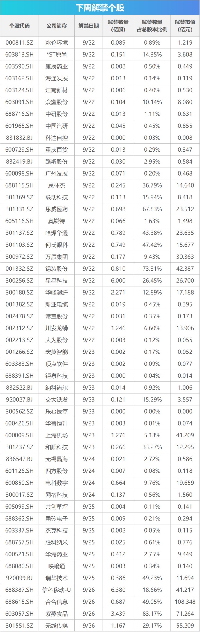 Wind 数据显示,下周限售股上市数量共计 28.79 亿股,以周五收盘价计算,解禁市值为 614.3 亿元,较本周量增价减。个股来看,解禁市值较大的公司有合合信息、无线传媒、信科移动、哈焊华通等。