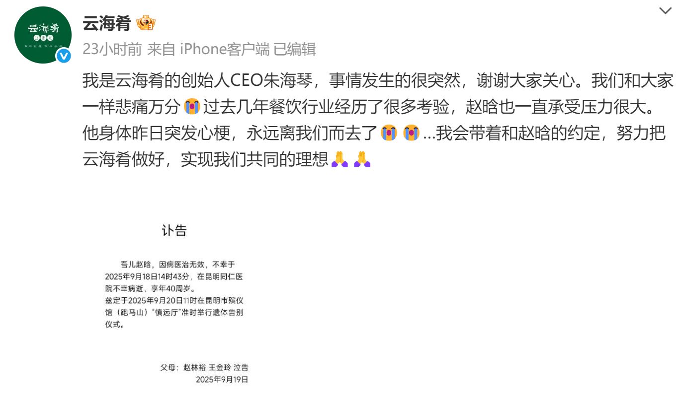 9 月 18 日,知名餐饮品牌云海肴创始人、中国人民大学 2004 级校友赵晗因心梗骤然离世,年仅 40 岁。