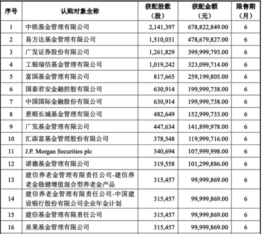 其中,中欧基金获配 214.14 万股,易方达基金、工银瑞信基金获配股数均超过 100 万股,富国基金、景顺长城基金、广发基金和汇添富基金分别获配 81.77 万股、48.26 万股、44.76 万股、37.85 万股。