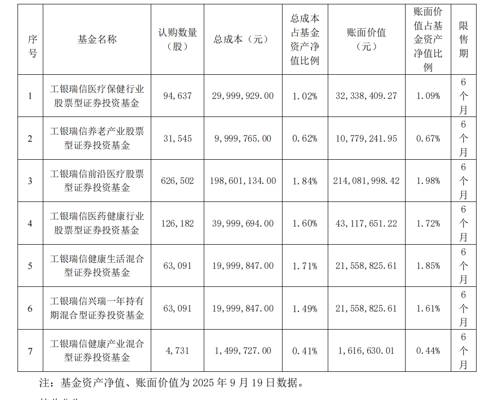 工银瑞信医疗保险行业、工银瑞信养老产业股票、工银瑞信前沿医疗和工银瑞信医药健康分别认购 9.46 万股、3.15 万股、62.65 万股、12.62 万股,成本合计约为 2.79 亿元。