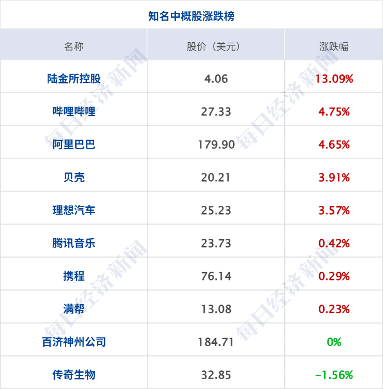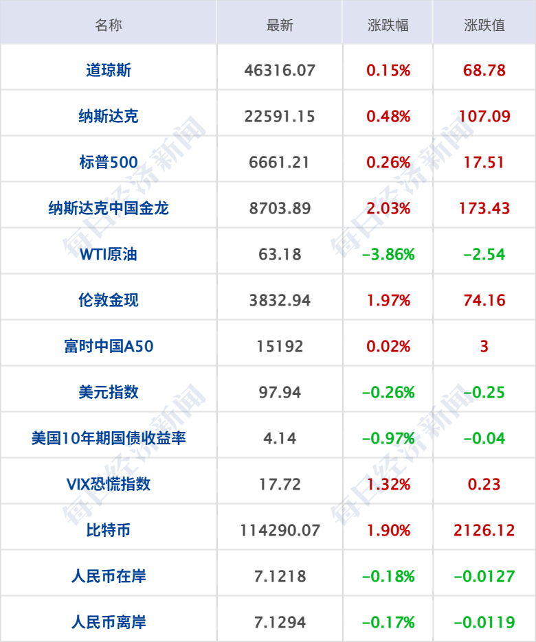 美股三大指数集体收涨,道指涨 0.15%,纳指涨 0.48%,标普 500 指数涨 0.26%,大型科技股涨跌不一,英伟达涨超 2%,亚马逊涨超 1%,博通跌近 2%;加密货币概念、金属原材料涨幅居前,Coinbase 涨超 6%,Circle、世纪铝业涨超 5%,南方铜业涨超 3%。纳斯达克中国金龙指数涨 2.03%,中概股普遍上涨,哔哩哔哩、阿里巴巴、新东方涨超 4%,理想汽车、京东涨超 3%,百度、蔚来涨超 2%。