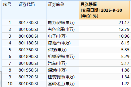 以申万一级行业划分,电力设备行业单月上涨 21.17%,涨幅领先。有色金属、电子行业单月涨幅超过 10%,房地产、传媒、机械设备、汽车行业涨幅超过 5%。