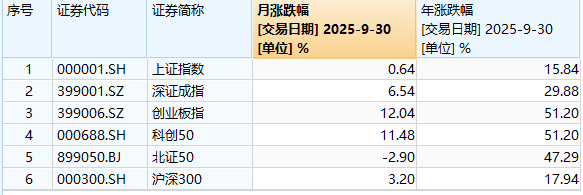 数据显示,截至 9 月 30 日收盘,上证指数报 3882.78 点,单月上涨 0.64%;深证成指报 13526.51 点,单月上涨 6.54%;创业板指报 3238.16 点,单月上涨 12.04%。