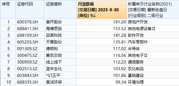 9 月涨幅排名前十股票依次是首开股份、海博思创、品茗科技、天普股份、德明利、香农芯创、线上线下、蓝丰生化、*ST 正平、复洁环保。其中,前 9 只股票单月股价完成翻倍。