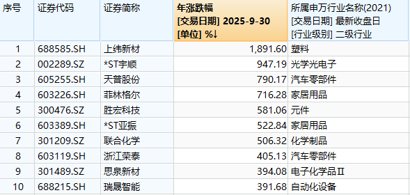 前三季度,上纬新材以 1891.60% 的巨大涨幅居首位,排名第二到第十的依次是*ST 宇顺、天普股份、菲林格尔、胜宏科技、*ST 亚振、联合化学、浙江荣泰、思泉新材、瑞晟智能,涨幅均超 390%。