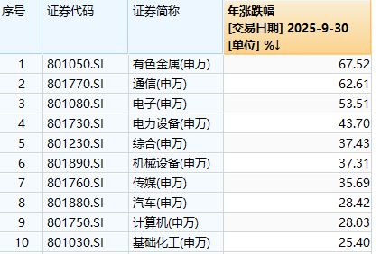 前三季度,有色金属行业与通信行业分别累计上涨 67.52% 和 62.61%,分列前两位。电子行业累计涨幅 53.51%,电力设备行业涨幅 43.70%,综合、机械设备、传媒行业累计涨幅均超 30%。