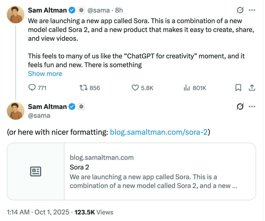 山姆·奥特曼在社交平台 X 发文介绍 Sora 2