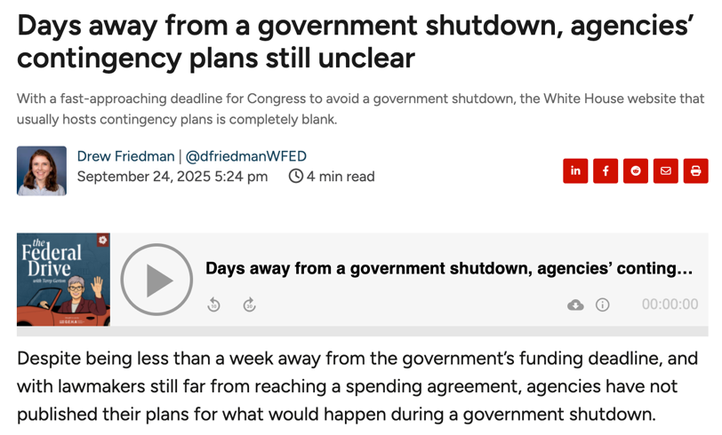 △专门聚焦报道联邦政府管理与政策的美国媒体 Federal News Network 报道,尽管政府面临 「停摆」,但两党在主要问题上的分歧远未达成一致。